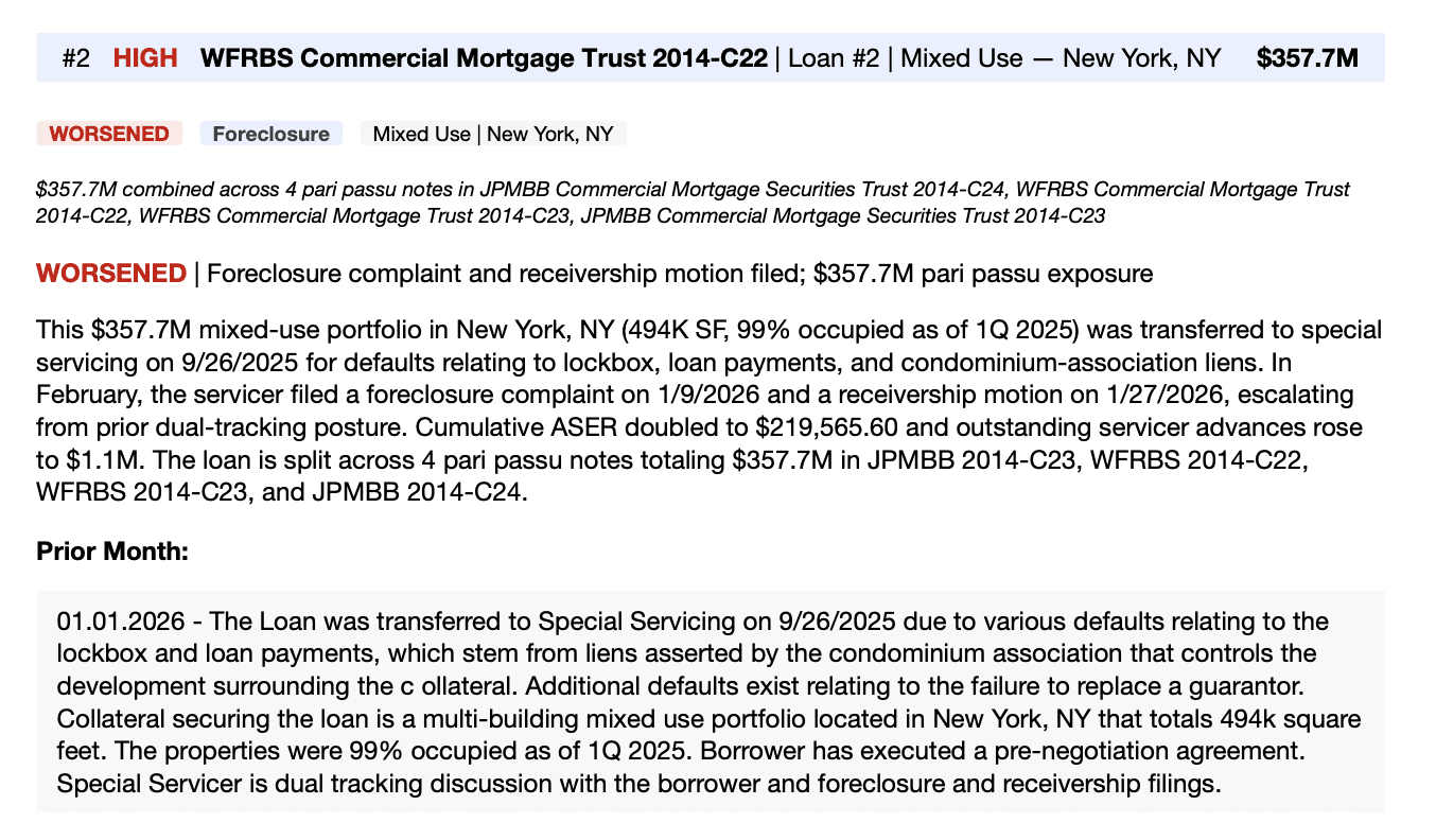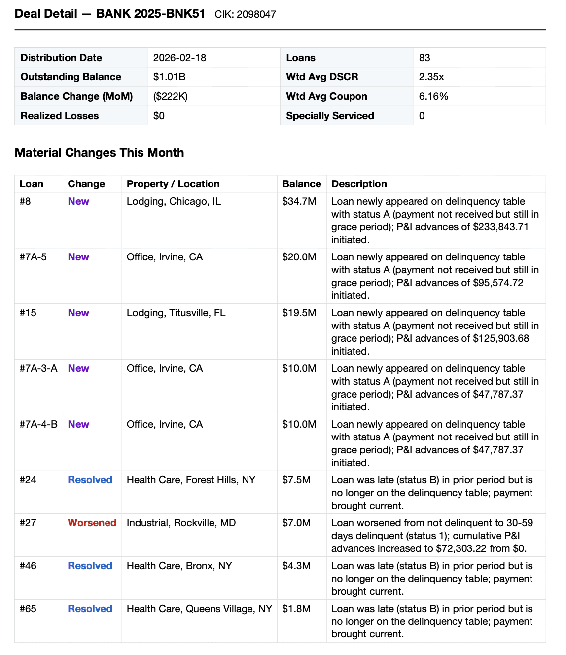 Every deal with material changes gets a detailed breakdown: which loans worsened, improved, or resolved, with balance impact and servicer narrative summaries.