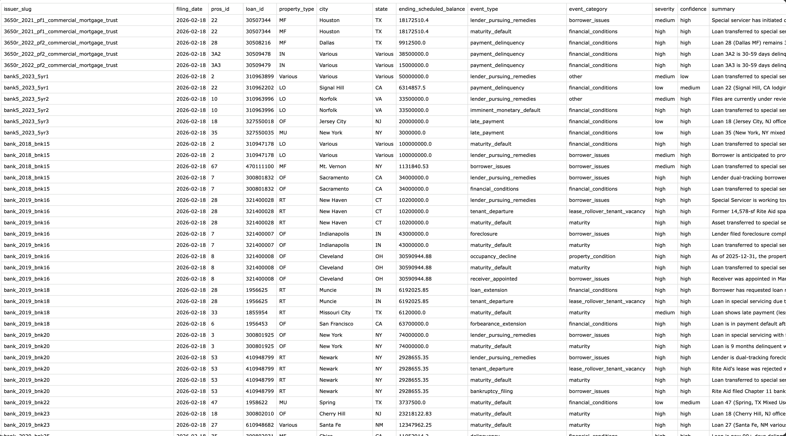 Extracted loan-level surveillance across the entire CMBS conduit universe. Servicer commentary diffs, delinquency tracking, and event classification, from 10-D filings you'd never have time to read yourself.