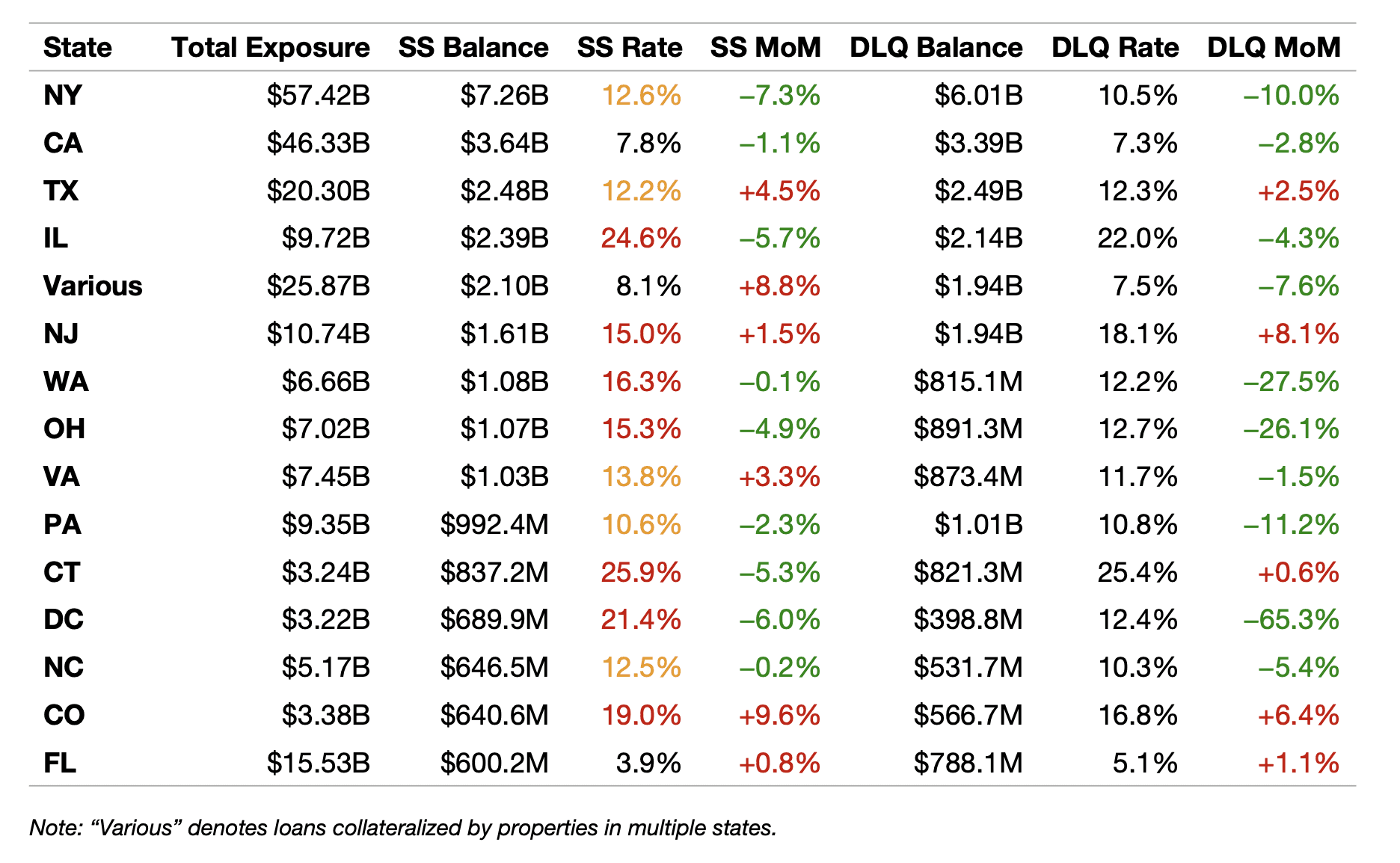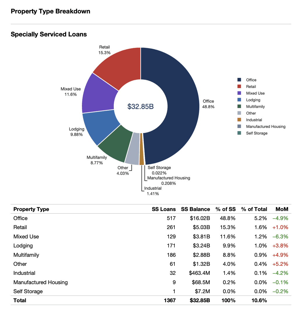 Specially serviced and delinquent loan concentrations by state and property type, with month-over-month trends and SS rates.